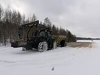 The KESLA 700T and Valtra T are ideally suited to working in Finnish weather conditions, making them the perfect team when spreading lime. The Kuusela family spreads lime all year round, whenever the driving conditions and schedule permits. A single clamshell bucket is capable of carrying 400-500 kg of lime.